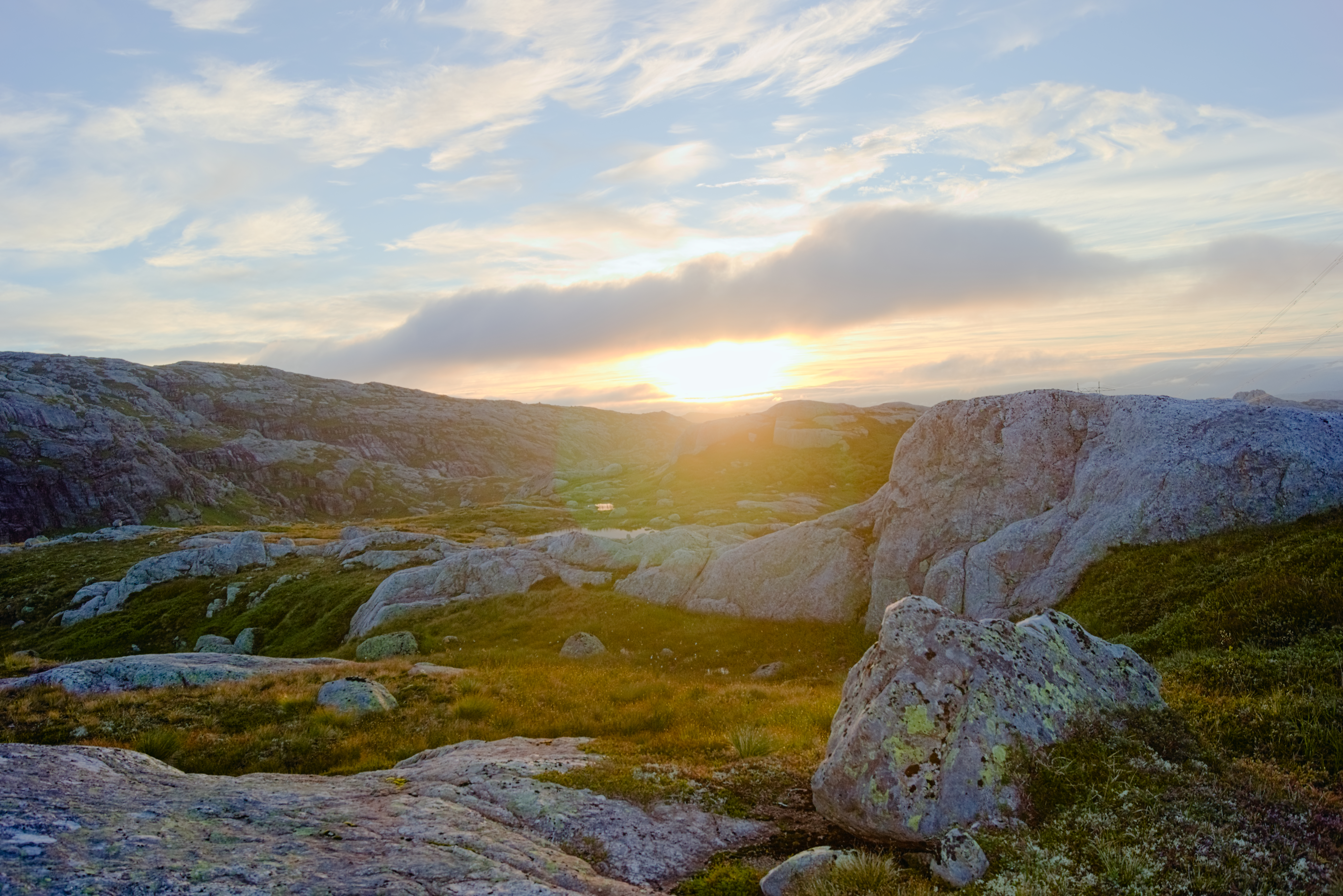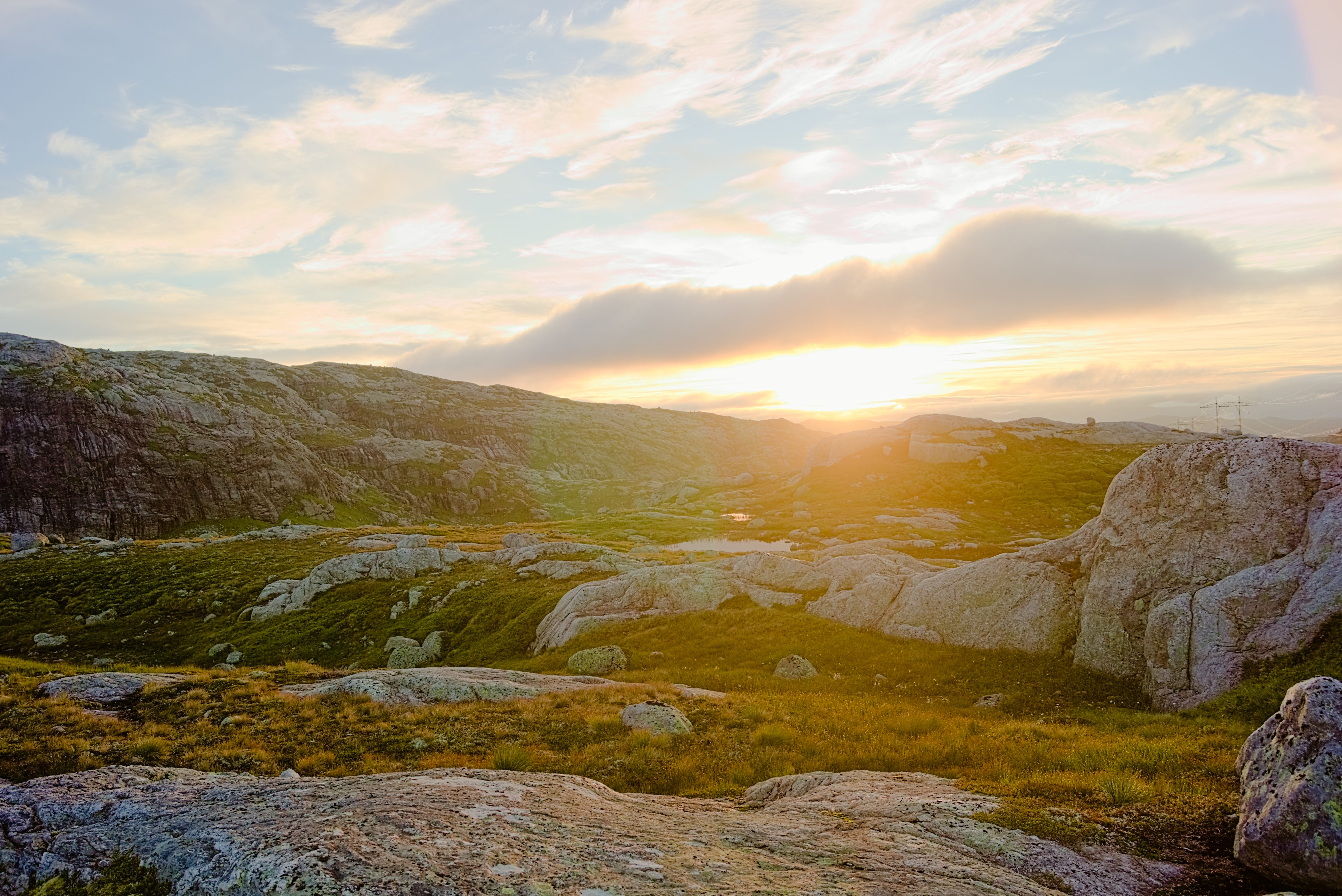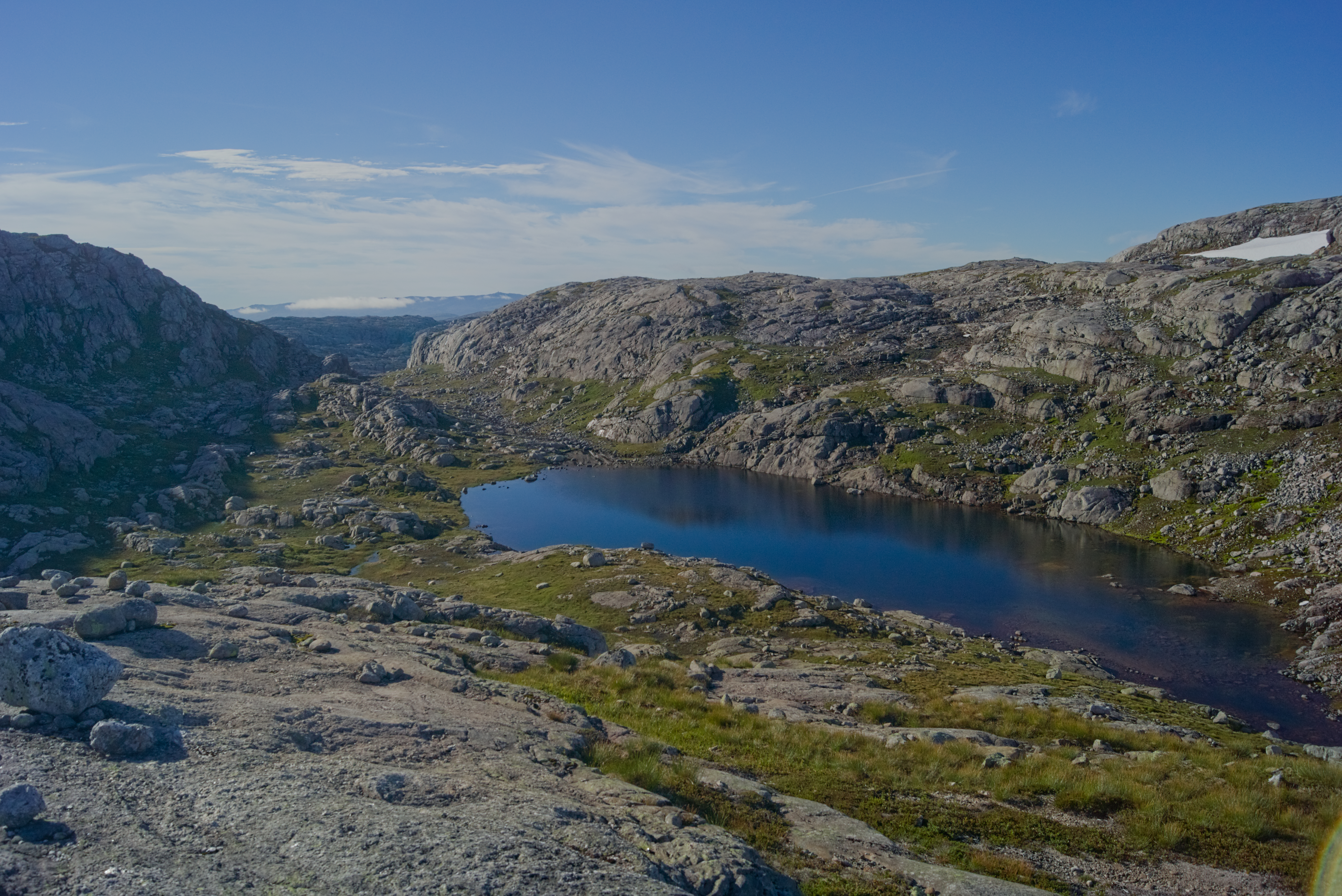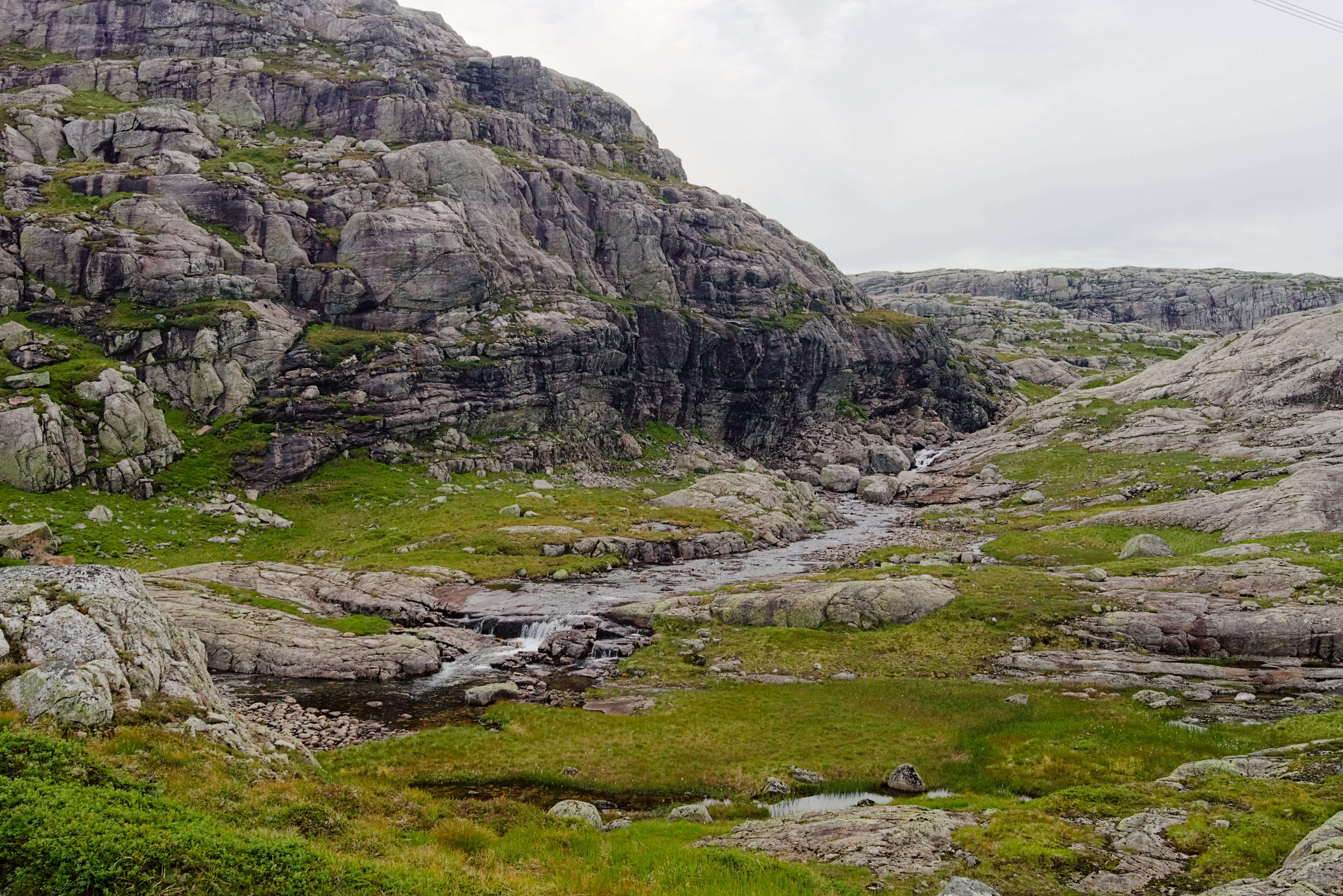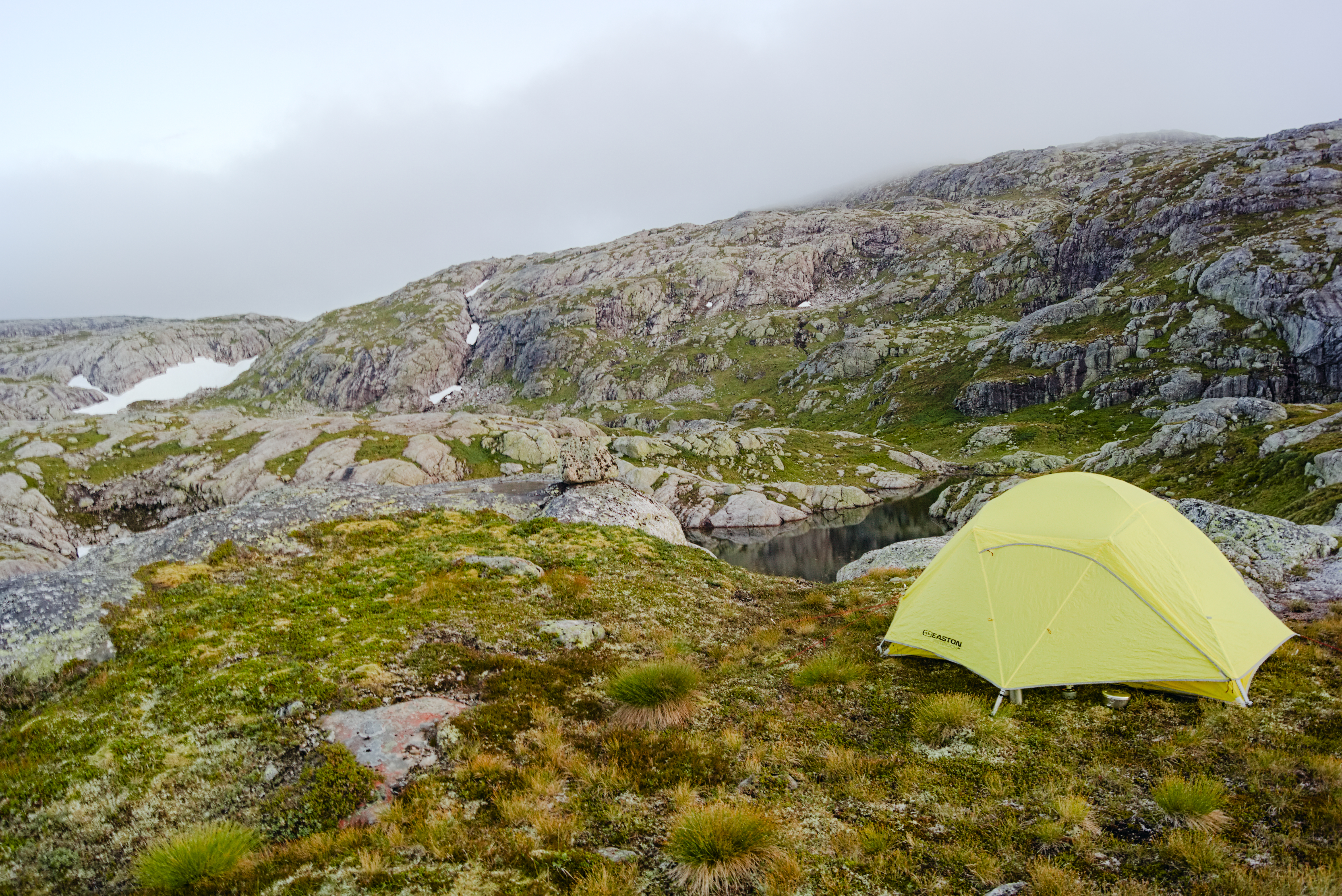 I stayed in a cabin the next night at the foot of a cliff. There were sheep everywhere, and it was very messy. I left the next morning and hiked in the clouds all day. It never really rained, but everything was soaked. I took a break to take a swim in the lake at the top of the pass, and lost my watch. Lucky for me, someone found it a brought it to the cabin where I stayed the next night.